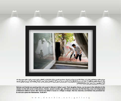 Bahram and Hanieh are washing their old carpet in Bahram’s father’s yard. Their daughter, Baran, can be seen in the reflection in the