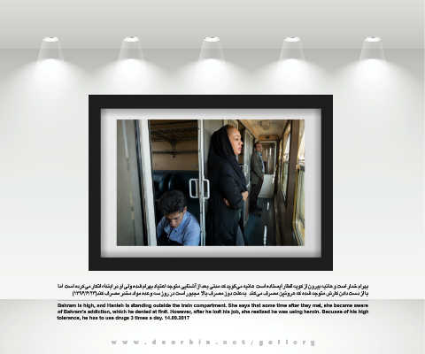 Bahram is high, and Hanieh is standing outside the train compartment. She says that some time after they met, she became aware