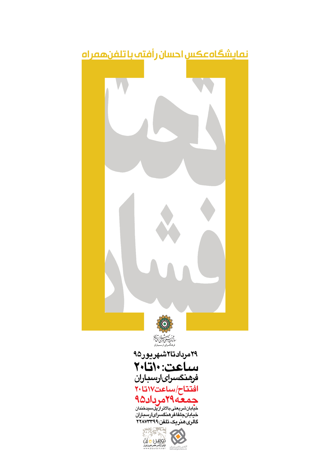اولین نمایشگاه انفرادی عکس احسان رأفتی با نام “تحت فشار” جمعه ۲۹ مردادماه ساعت ۱۷ تا ۲۰ در فرهنگسرای ارسباران افتتاح می شود.